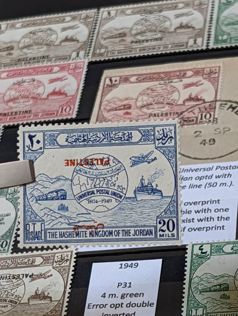 This beautiful 5-set series is one of my favorites! It celebrates the Universal Postal Union, which was established in 1874 and features a globe, airplane, train and ship. 75th Anniversary of Universal Postal Union issued by Jordan in 1949. SG P33 20 m. blue overprint double inverted.