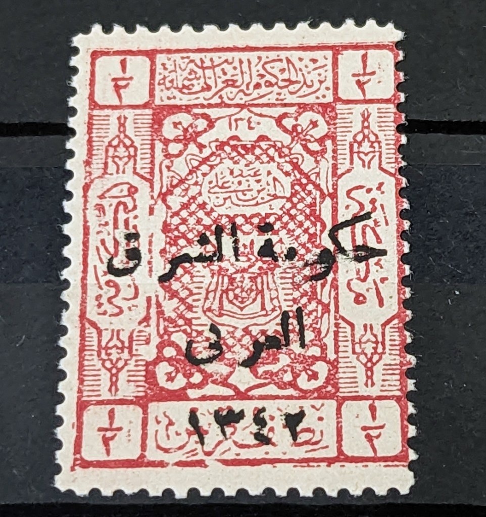 Stamps of Saudi Arabia, Overprint, “Government of the Arab East, 1342.” Overprinted issue on the stamps of the Hejaz issued in 1924. SG 127. In 1920 the British administration issued an EEF stamp with an overprinted Arabic inscription Sharqi Al Urdunn (East of Jordan). Before the establishment of Hashemite rule in Transjordan, these stamps referred to lands east of the Jordan River. In Transjordan, Palestinian, Hijazi and Syrian stamps were also used with the same inscriptions.