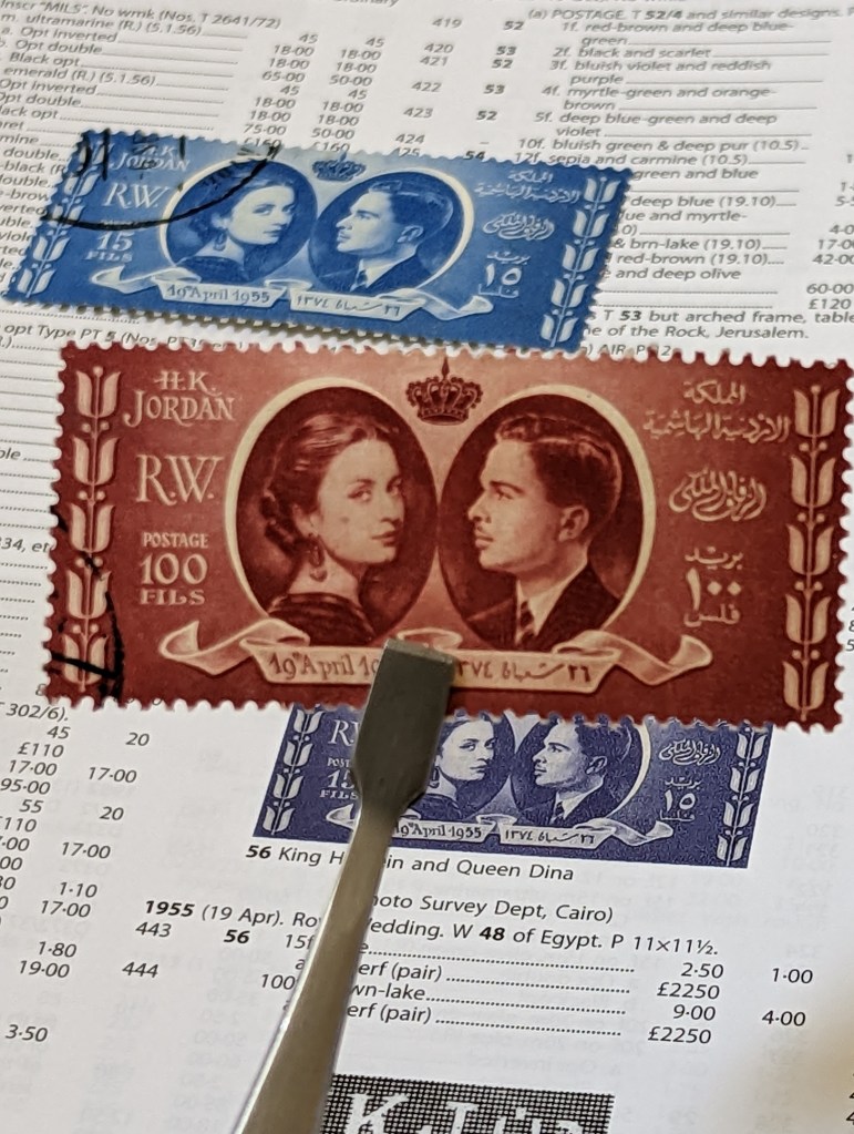 Royal Wedding of King Hussein and Queen Dina. Issued by the Hashemite Kingdom of Jordan in 1955. SG 443-44.