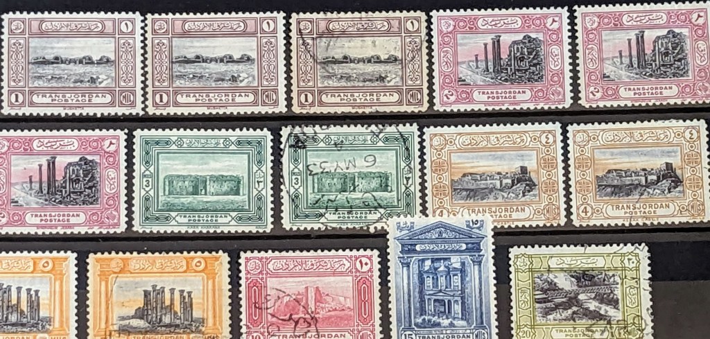 In 1927, Transjordan issued its first set of definitive postage stamps in the Palestinian currency (Millime). This stamp of Emir Abdullah who was the son of Sharif Hussein bin Ali, a Hashemite leader who ruled Mecca and Medina on behalf of the Ottoman Turks. Abdullah fought alongside Lawrence of Arabia against the Ottoman Empire during World War I.